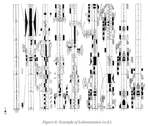 This is a Laban notation, it was invented by the Hungarian choreographer Rudolf von Laban (1879-1958). Although Laban's ethical history is debated, his invention of notation was disruptive within modern and contemporary dance.