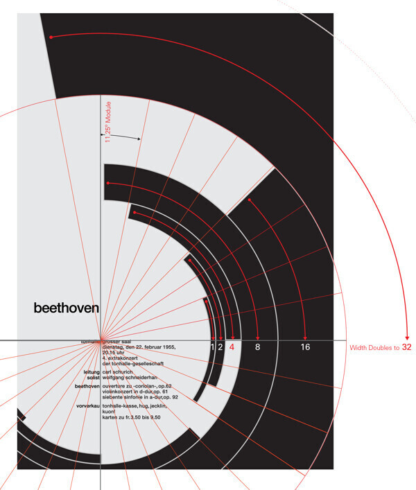 This is a poster designed by Willem Crouwel for a Beethoven concert, the red lines drawn by Rachel Haggerty expose the diagram laying underneath the design.