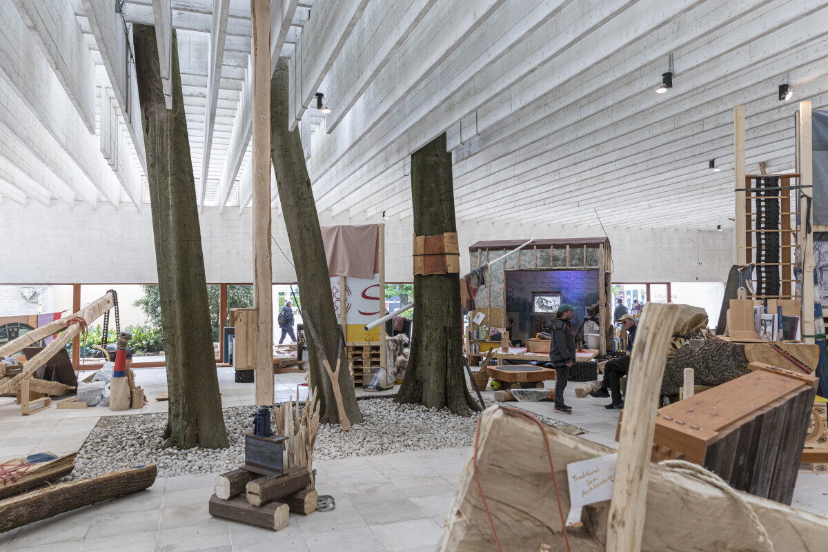 However nationalistic or architecturally refined the pavilions can seem, most make sure to let the art speak for itself inside the space. There are however some exceptions, one of them being the Japanese pavilion. It is elevated with concrete pilotis and has an opening in the floor and ceiling, making interactions between the roofed ground floor and the first floor a point of attention for Japanese artists. Because of this, vertical, multi-part installations are often placed there.