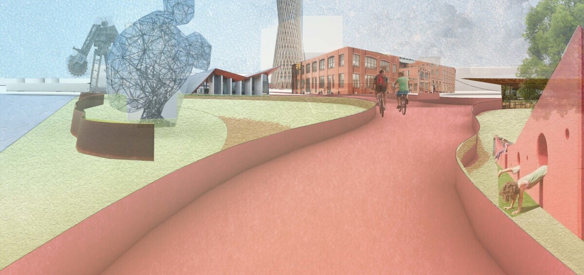 Stel je voor dat je net als velen door de Maastunnel komt gefietst en voor je staat een indrukwekkende skyline aan kunstwerken. Tussen de kunstwerken staan bijzondere campusgebouwen verspreid over een speels park waar fiets- en wandelpaden doorheen ensceneren. Alle fysieke barrières die ooit bestonden om bij het water te komen zijn verdwenen. De stellages, kranen en grote constructies die zo kenmerkend zijn voor het havenbeeld worden nu vergezeld met enorme kunstwerken van Rotterdamse artiesten. Kunstwerken die van het voormalig haventerrein een beeldenlandschap maken. De campus is alles behalve geïsoleerd. Duizenden studenten maken net als toeristen en omwoners dankbaar gebruik van de horeca aan het water en de inspirerende omgeving waar iedereen doorheen beweegt, of dat nou vanuit de wijk, de tunnel of de campusbibliotheek is. Het beeldenlandschap trekt namelijk de studenten uit een academisch isolement doordat we er een landschap van maken dat voor iedereen toegankelijk en aantrekkelijk is en dus niet alleen voor studenten is bedoeld. Langzaamaan breidt dit landschap uit over de rest van de Maashaven waar het plek maakt voor start-ups en andersoortige bedrijvigheid, zoals het pretpark wat nu wordt gebouwd. De haven blijft open voor de binnenvaart, maar wordt ietwat teruggebracht om de publieke functie van de haven te versterken. De fietsweg vanuit de wijken en de Maastunnel slingert door het landschap en gaat hier en daar langs, door of zelfs over de kunstwerken en gebouwen zodat je ook vanuit beweging de omgeving ervaart.