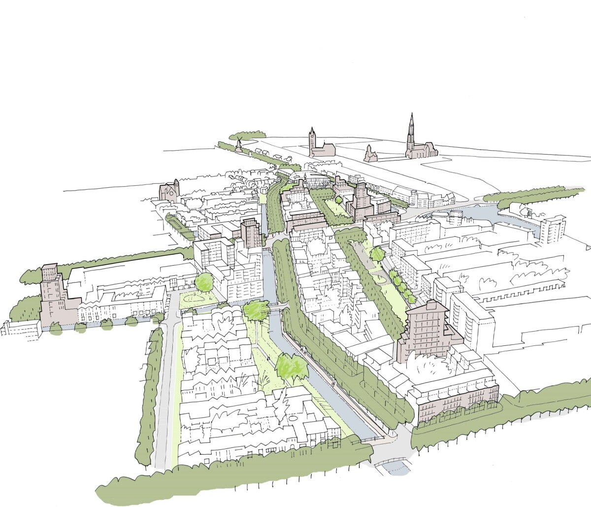The Van Leeuwenhoek neighborhood is at the westside surrounded by the new canal, the Nieuwe Gracht, an important road with a broad canal from north to south. The Nieuwe Gracht constructs an important new element, which is related to the historical morphology of Delft, in the spatial structure of Nieuw Delft.