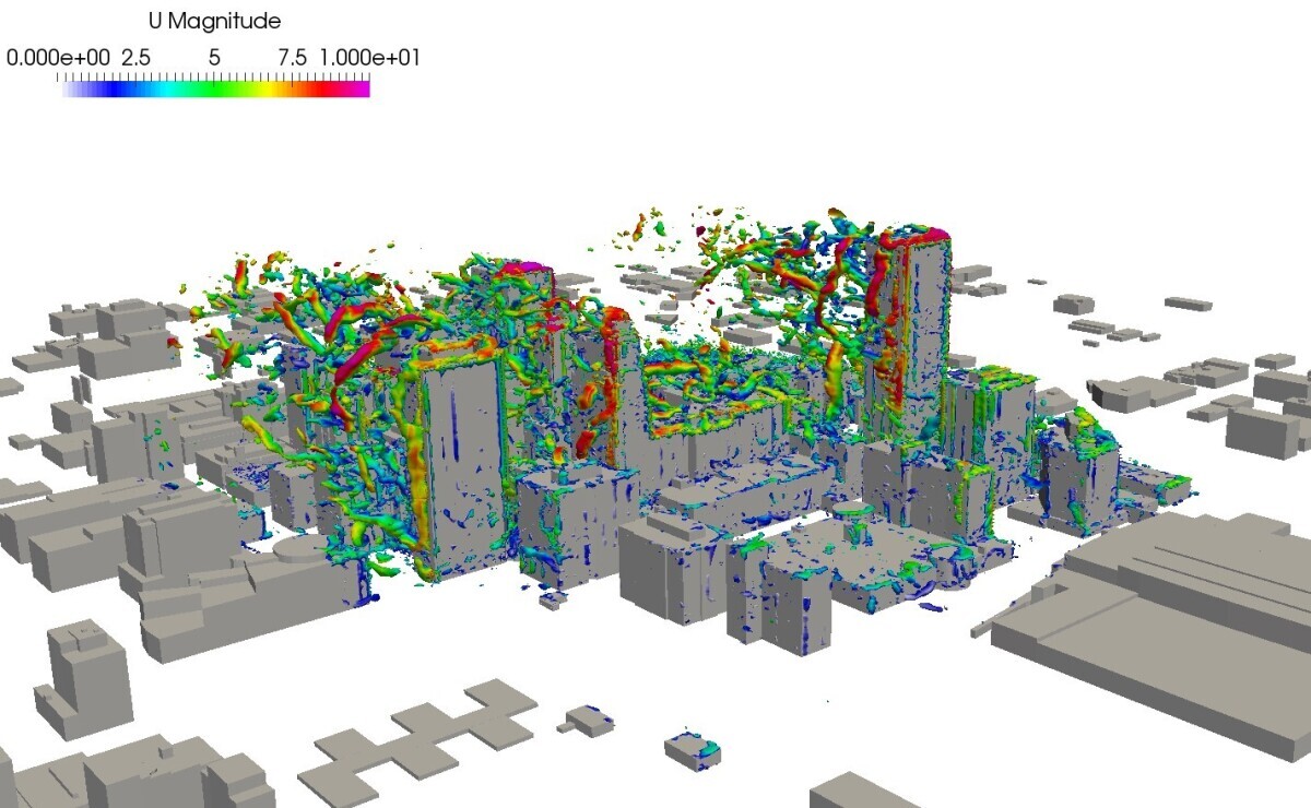 EWI is just one of the many different architectural buildings build on the Mekelweg over the decades. For many BKer’s this is a wonder to behold, for others a thorn in the eye. It is not always easy to determine what impact a new architectural design might have on its surroundings. While the building might look wonderful in isolation, the effect its neighbours have is crucial to the overall design. City modelling can help us gain a better perspective of the impacts that new designs might have. While in the image the wind is the emphasis, we can replace this with detailed textures of the buildings granting us a realistic view of the area.