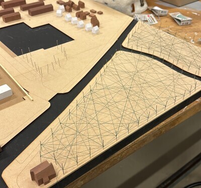 Step 3: Skip the vegetation and use symbolic items to resemble the context. Trees are pretty, and as much as we love greenery, in models, it can look sloppy, or it can take ages to make realistic-looking trees. That’s why it’s always a nice solution to use symbolic items for the context instead of actual trees. Paper rolls, like quilling, for larger-scale models or even needles and threads for a compact area of trees, can showcase your model’s context.