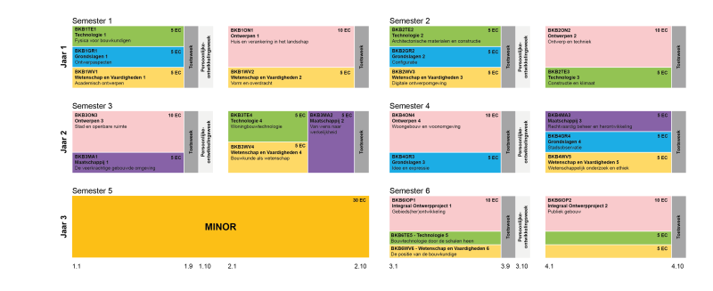 Hieronder is het blokkenschema van het BSc curriculum te zien. Meer informatie over de bachelor Bouwkunde is hier te vinden.