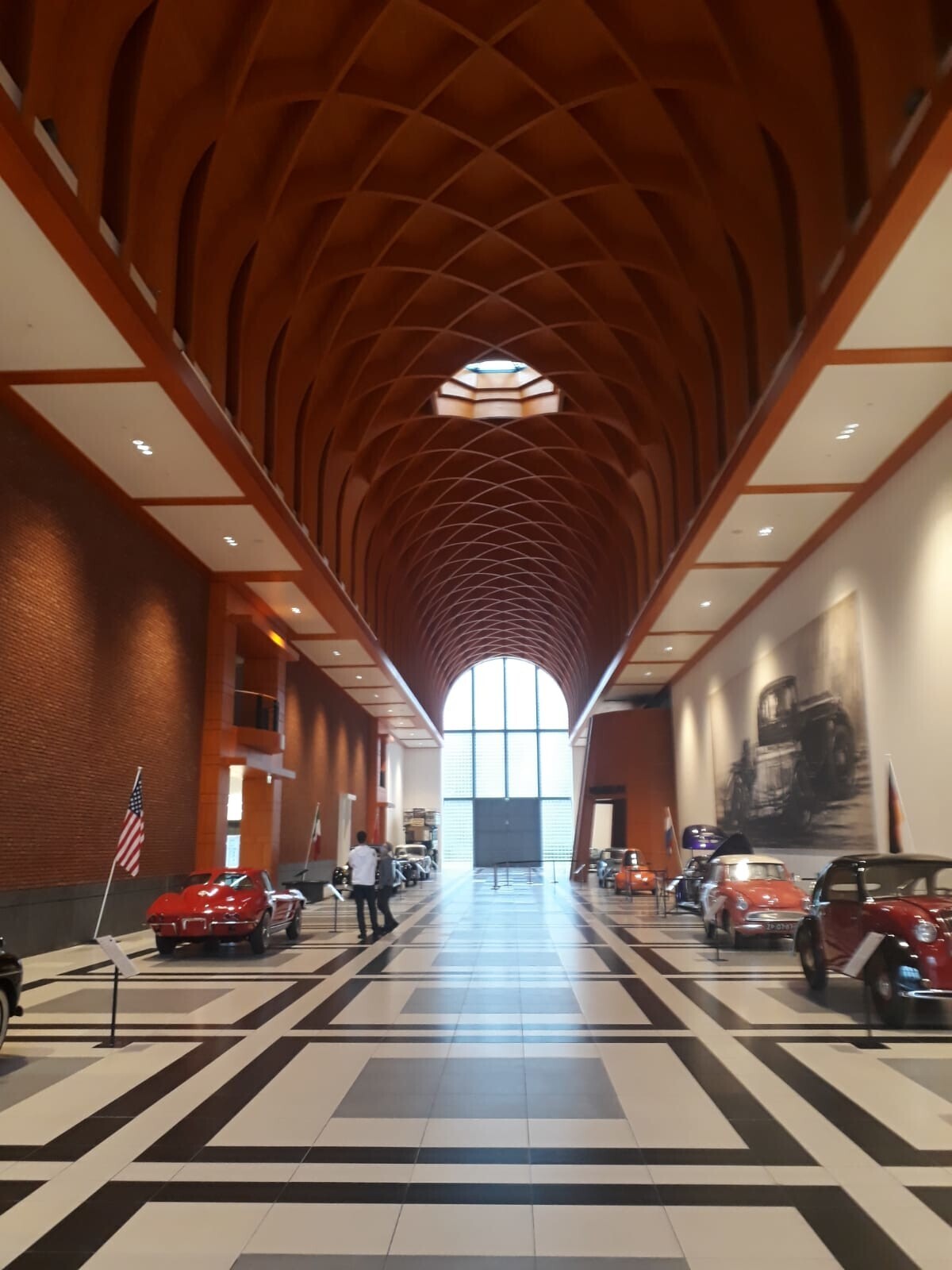A funny thing is that this museum is easiest accessible by car, as it is located along a road but outside the city center, surrounded by woods and grass land. The big red brick building, u-shaped with a typical triangle volume at both sides, is designed by American architect Michael Graves and built in 2010. After entering in the foyer, you immediately arrive in the big hall, my favourite space of the museum. This hall is 90 meters long and 15 meters high, and has a beautiful curved CLT roof structure. This is where the “showcase” cars are and temporary exhibitions.